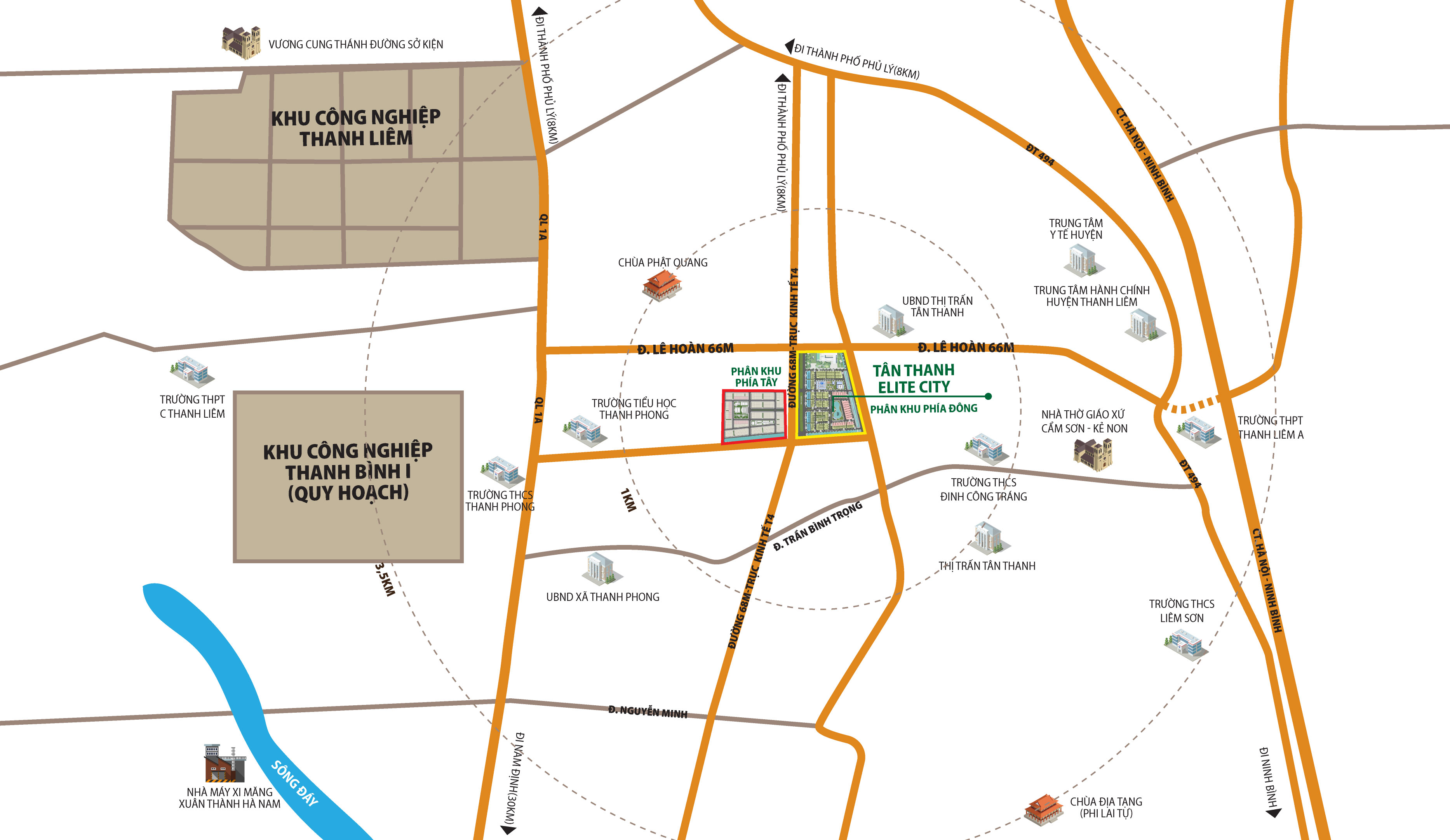 Chỉ cách Hà Nội khoảng 50 km, Phủ Lý 5 km, Khu đô thị Tân Thanh Elite City sở hữu liên kết vùng đặc biệt là sự giao thoa hoàn hảo giữa cuộc sống “Văn minh” Giá trị tinh thần “Du lịch Tâm Linh” và kết nối “Kinh tế - xã hội” khu vực.